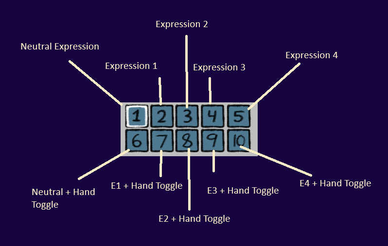 A: If you are having me rig your PNGtuber, I rig it in PNGtuber+, which unfortunately only has 10 toggle slots at this time. My personal recommendation is to have 5 expression slots, one being your neutral toggle, with the other 5 slots being each expression plus your hand toggle of choice. This is what my base PNGtuber pack has. If you want to hand toggles instead of none and one, then you can have that as an add-on.